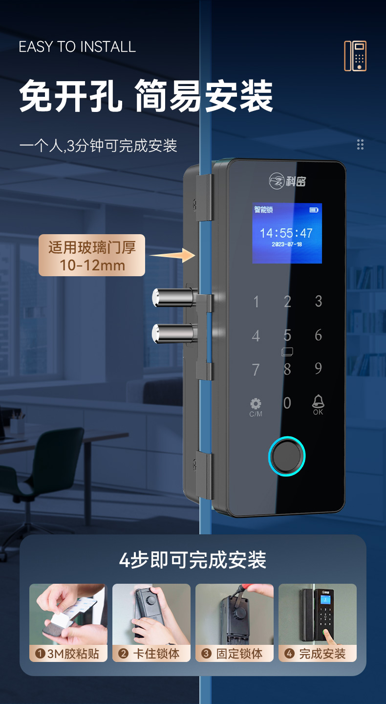 科密TOM-171玻璃門密碼鎖有框無框單雙開門辦公室免開孔智能電子指紋門鎖